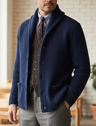 בגדי ריקוד גברים סוודר קרדיגן סוודר קצוץ סוודר סרוג מצולע לִסְרוֹג חוּלצָה כיס אחיד צווארון צעיף (שאל) אופנתי קלסי לבוש יומיומי פגישה (דייט) ביגוד סתיו חורף שחור כחול נייבי S M L