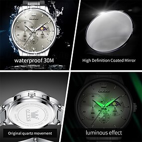 שעון קוורץ עסקי לגברים OLEVS 3676 פלדת אל חלד עמיד במים שלב ירח פרט עתיק של מותג