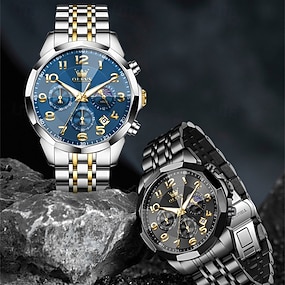 שעון קוורץ OLEVS לגברים אופנתי נעים עם שלב ירח לוח שנה כרונוגרף שעון פלדת אל-חלד