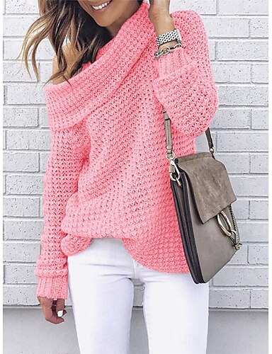 בגדי ריקוד נשים סוודר יום יומי רך צבע אחיד שמנמן כתפיה אחת סרוג שרוול ארוך חולצות רגילות לִסְרוֹג בָּחוּץ יומי סוף שבוע לבן ורוד מסמיק סתיו חורף