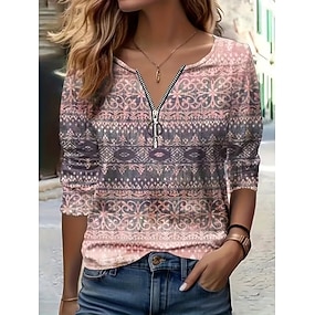 T-Shirt נשים רבע רוכסן שרוול ארוך קז'ואל גרפי אומברה פסיפס אלגנטי נוסטלגי אלגנטי V צוואר טופים רגילים יומי אדום כחול סגול ירוק חאקי אביב סתיו