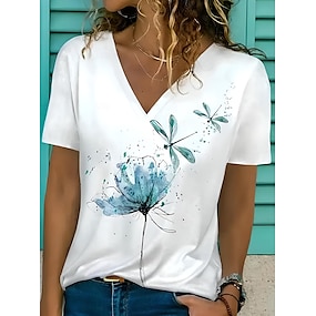 בגדי ריקוד נשים חולצה קצרה פרחוני יום יומי שרוולים קצרים צוואר מחורץ חולצות רגילות יומי דפוס לבן קיץ אביב