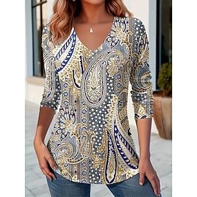 חולצת טי לנשים גרפי גיאומטרי פייזלי וינטג' אופנתי קלאסי שרוולים ארוכים צווארון עגול צווארון עגול רגיל חולצות יומי הדפס כחול רויאל חום ירוק קיץ אביב סתיו