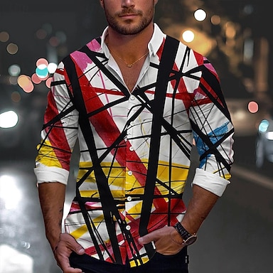 בגדי ריקוד גברים הדפסת 3D תבנית גאומטרית חולצה עם כפתורים חולצות מודפסות שרוול ארוך תת תרבותי חופשה מפלגה רחוב אביב קיץ צווארון מתקפל דפוס כפתור למטה צהוב אודם סגול כתום תלתן