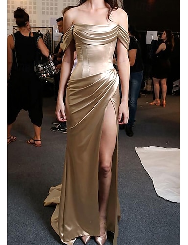 גזרת A מעטפת \ עמוד שמלות ערב אלגנטית לבוש רשמי רשמי חתונה שובל סוויפ \ בראש ללא שרוולים סטרפלס סאטן עם קפלים 2025