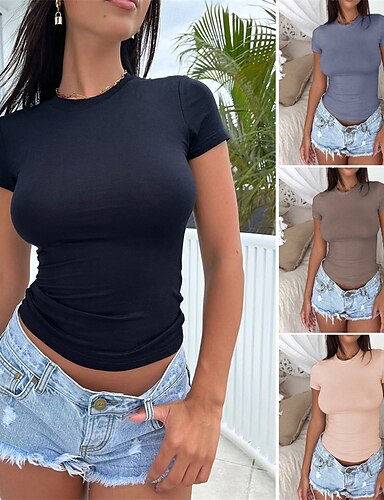 בגדי ריקוד נשים חולצה עם טקסטורה חולצה קצרה אחיד אופנתי מודרני שרוולים קצרים צווארון עגול קצר חולצות רגילות יומי שחור חום בהיר אפור קיץ