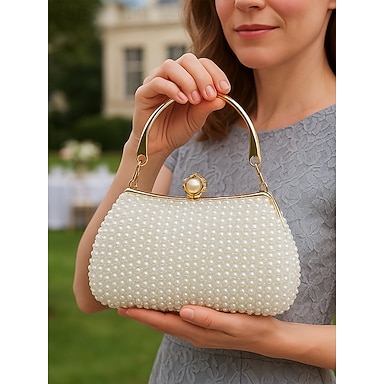 תיק קלאץ' ערב לנשים משובץ פנינים עם ידית זהב, תיק יד אלגנטי לחתונה, מסיבת קוקטייל ואירועים רשמיים - זמין במגוון צבעים