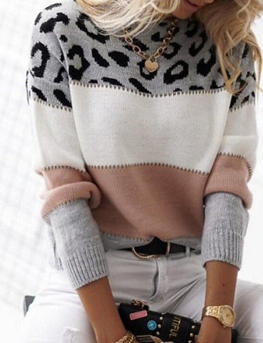בגדי ריקוד נשים סוודר סגנון רחוב יום יומי נמר צווארון עגול קצר טלאים סרוג דפוס שרוול ארוך חולצות רגילות לִסְרוֹג בָּחוּץ חגים ליציאה צהוב ורוד מסמיק סתיו חורף