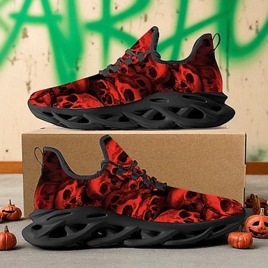 נעלי ספורט לבנות לגברים עם גולגולת אימה והדפס גרפי אדום למסיבות ליל כל הקדושים, פסטיבלי מוזיקה ואופנת רחוב עירונית