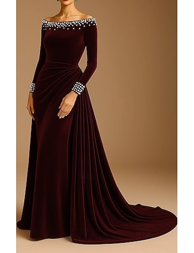 גזרת A מעטפת \ עמוד שמלות ערב אלגנטית לבוש רשמי רשמי חתונה שובל סוויפ \ בראש שרוול ארוך סירה מתחת לכתפיים סאטן עם קפלים אסוף 2025