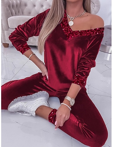 בגדי ריקוד נשים אופנתי סגנון רחוב יומי ערכות מכנסיים שרוול ארוך צווארון V צבע אחיד פאייטים טלאים חג מולד קזו'אל יומי יין אביב רגיל