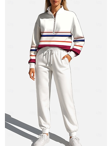 בגדי ריקוד נשים טרנינג אימונית חליפת ריצה שרוך רוכסן גיאומטרי ז'קט ומכנס טרנינג סט לבוש אתלטי אביב לבן אגבי להתאמן חוץ רך בג'י שרוול ארוך ספורט לבוש אקטיבי מיקרו-אלסטי מונח בצורה רפויה