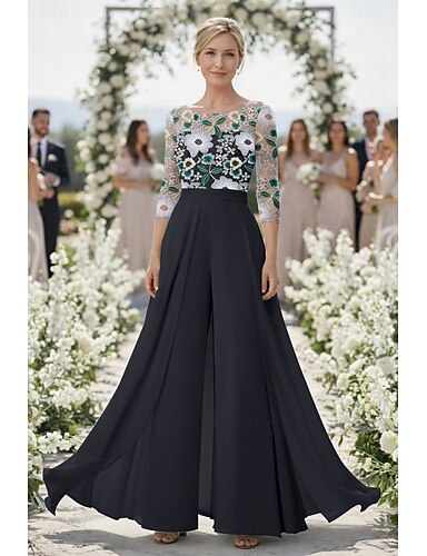חליפת מכנסיים באורך הקרסול שמלה לאם הכלה שרוול 4\3 סקופ צוואר אלגנטית מסיבה רשמי אורחת חתונה שיפון תחרה עם אפליקציות