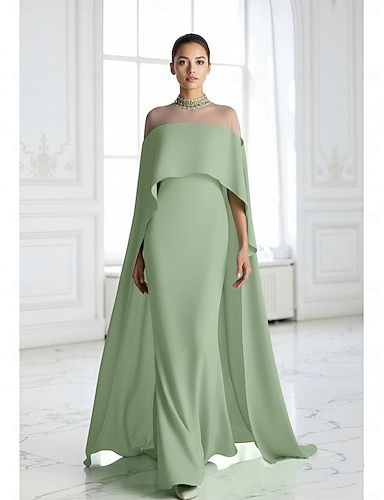 בתולת ים \ חצוצרה עד הריצפה שמלת נשף עם גלימה שמלות ערב לבוש רשמי אלגנטית עשוי משי שרוולים קצרים סירה רחב רשמי חתונה שכמיות סאטן עם צעיף