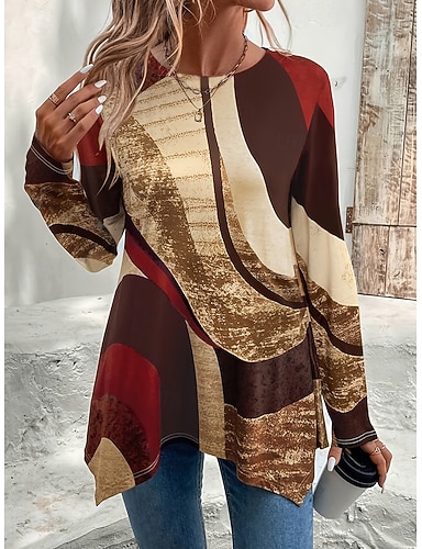 בגדי ריקוד נשים חולצה קצרה גראפי גיאומטרי וינטאג' מסוגנן יום יומי שרוול ארוך צווארון עגול קצר חולצות רגילות יומי דפוס א-סימטרי אודם סגול חום תלתן חאקי קיץ אביב סתיו