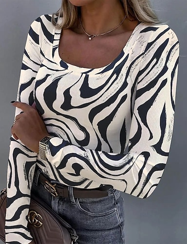 חולצת נשים טי שירט ארוכה עם שרוולים גרפית ריבודית צוואר מרובע ארוך קז'ואל טוניקה אבסטרקטית זברה וינטאג' אלגנטית רגילה לכל יום הדפס כחול סגול ירוק חאקי אביב סתיו לפני סתיו