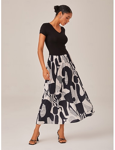 בגדי ריקוד נשים נשים שמלת קז'ואל שמלה ארוכה שמלת מקסי שחור שרוולים קצרים גיאומטרי קיץ צווארון עגול קצר חופשה מודרני XS S M