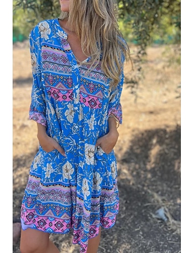 שמלת מידי נשים לחג ההאלווין צוואר V שרוולים ארוכים כפתן קליל מתאים רפוי שמלת A-Line מזדמנים בוהו הולכים החוצה גרפיקה פרחונית שרוולים ארוכים צוואר V ורוד כחול שמנת סתיו