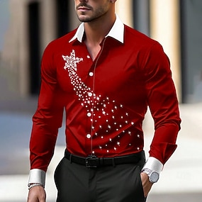 חג המולד בגדי ריקוד גברים פתית שלג שמלת שמלה חולצה עם כפתורים שרוול ארוך אופנה קז'ואל חופשה בגדי ערב למסיבה לבוש ליום קיץ אביב סתיו חולצות עם צווארון הדפסת תלת מימד אודם פול תלתן