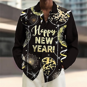 ראש השנה בגדי ריקוד גברים אותיות סצנת חג המולד חולצה שרוול ארוך יום יומי ליציאה סוף שבוע סתיו חורף צווארון מתקפל דפוס כפתור למטה שחור צהוב זהב