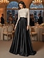 שמלת ערב שחורה ולבנה צמודה עמוד אלגנטית שמלה רשמית חתונה עד הרצפה שרוול באורך 3/4 צוואר מרובע קרפ אלסטי עם תחרה משובצת פרחים