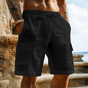 בגדי ריקוד גברים מכנסיים קצרים שורטים מכנסי פשתן מכנס קיץ קצר מכנסי חוף שרוך אלסטית מותניים כיס מרובה אחיד באורך הברך בָּחוּץ יומי חוף חופשה הוואי שחור לבן סטרצ'י (נמתח)