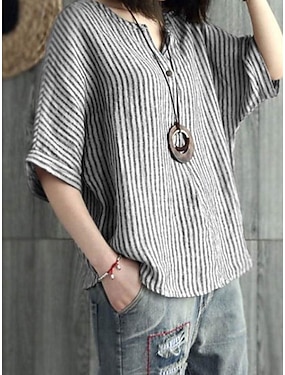 חולצת נשים פשתן כותנה גרפית אלגנטית נוסטלגית מסוגננת שרוול קצר צווארון בצורת V טופים רגילים יומיומיים חופשה כפתורים כחול אפור קיץ אביב