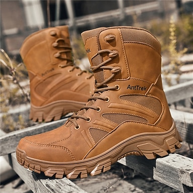 מגפיים טקטיים לגברים מעור דמוי עור בצבע חום בהיר עם סוליה נגד החלקה ומבנה נושם, מגפי עבודה עמידים לפעילויות חוץ צבאיות, טיולים רגליים וקמפינג