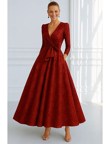 שמלות ערב A-Line אדום כחול אלגנטיות שמלה רשמית רשמית חתונה אורך רצפה חצי שרוול צוואר V כיס תחרה עם קשת(ות) רצועת