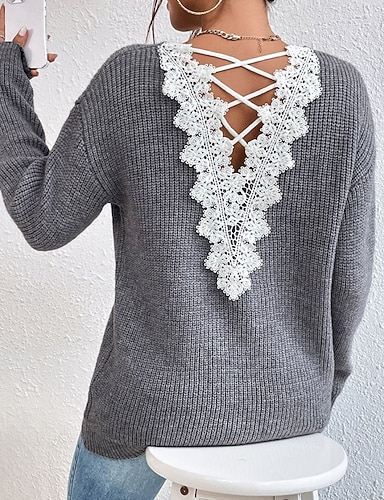 בגדי ריקוד נשים סוודר סגנון רחוב סקסי צבע אחיד צווארון V תחרה טלאים סרוג שרוול ארוך חולצות רגילות לִסְרוֹג בָּחוּץ יומי חגים שחור פול סתיו חורף