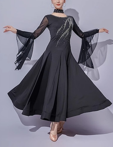 ריקודים סלוניים שמלה ריינסטון שחבור בגדי ריקוד נשים הצגה מפלגה שרוול ארוך רשת ספנדקס אורגנזה