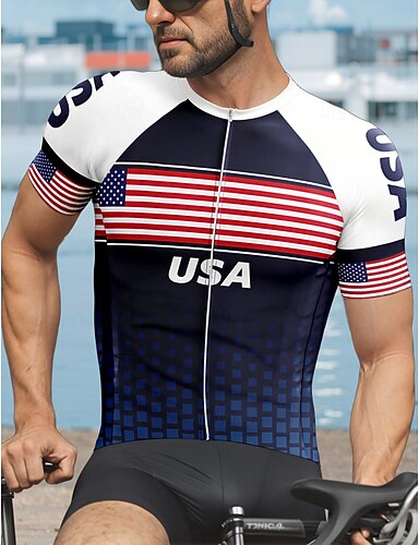 בגדי ריקוד גברים חולצת ג'רסי לרכיבה גראפי גיאומטרי יום העצמאות שרוולים קצרים אופנייים טי טי ג'רזי צמרות עם 3 כיסים אחוריים עמידות UV ייבוש מהיר רוכסן קדמי רצועות מחזירי אור ספורט כחול כהה ביגוד