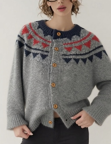 קרדיגן לנשים ויקינג וינטג' קז'ואל גרפי גיאומטרי צלעות קפוצ'ון טלאים כיס כפתורים שרוול ארוך חולצות ארוכות סריג חוץ סוף שבוע שחור סתיו