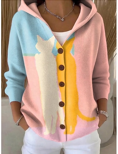 בגדי ריקוד נשים קרדיגן יומי יום יומי גראפי חיה מצולע עם קפוצ'ון כיס כפתורים דפוס שרוול ארוך חולצות ארוכות לִסְרוֹג בָּחוּץ סוף שבוע פול סתיו חורף