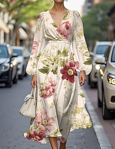 בגדי ריקוד נשים שמלת מידי שמלת קז'ואל שמלה הדפסה אלגנטית אופנתי בָּחוּץ מפלגה חגים רגיל פרח שרוול ארוך צווארון V לבן ורוד מסמיק בז' קיץ אביב