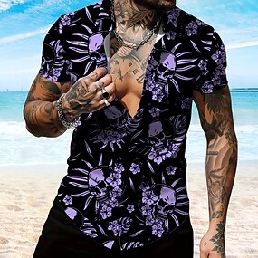 בגדי ריקוד גברים עלה שלד חולצת הוואי חולצת אלוהה שרוולים קצרים הוואי מחריד חופשה קיץ אביב צווארון מתקפל כפתור למעלה לבן פול סגול תלתן