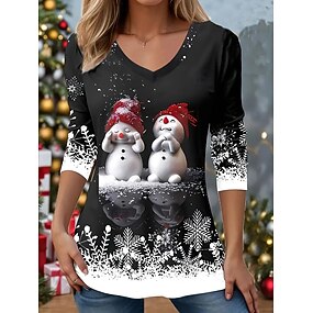 חג המולד בגדי ריקוד נשים חולצה קצרה גראפי איש שלג פתית שלג וינטאג' מסוגנן קלסי שרוול ארוך צווארון V חולצות רגילות יומי דפוס שחור אביב סתיו חורף