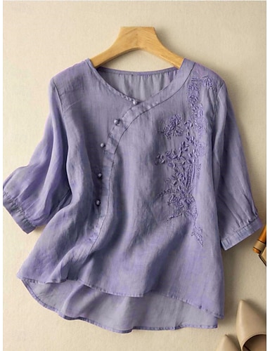 בגדי ריקוד נשים חולצה חולצות פשתן מכותנה צבע אחיד מסוגנן יום יומי שרוול 4\3 צווארון עגול קצר חולצות רגילות יומי רקום כפתורים צהוב אודם סגול תלתן קיץ אביב