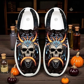 גולגולת ליל כל הקדושים כתומה לנשים &נעלי ספורט בד עם הדפס ורדים ודלעת - נעליים קז'ואל עם שרוכים לסגנון רחוב סתיו &מסיבות תחפושות