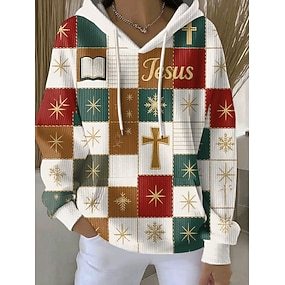 בגדי ריקוד נשים סווטשירט קפוצ'ון סוודר גראפי גיאומטרי חג מולד אלגנטית חם פעיל שרוול ארוך עם קפוצ'ון חולצות רגילות רחוב לבוש ליום קזו'אל טלאים דפוס שחור אביב סתיו חורף
