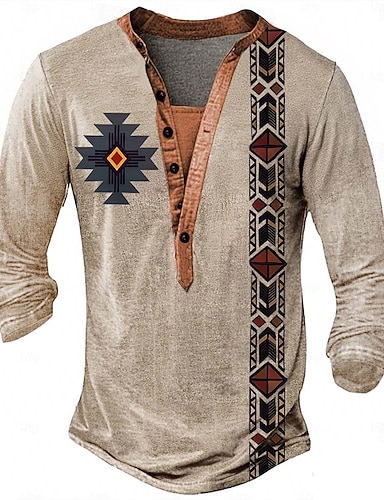 בגדי ריקוד גברים גיאומטרי דפוס חולצה קצרה חולצת הנלי שרוול ארוך מעצב רטרו\וינטאג' אתני רחוב קזו'אל יומי קיץ אביב סתיו חאקי הנלי חולצת טריקו של הנלי