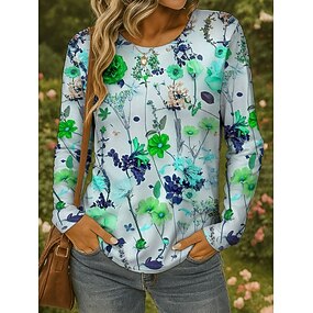 חולצת נשים עם שרוול ארוך צווארון עגול טוניק גרפית פרחונית צמחים אלגנטית וינטג' בסגנון קלאסי טופס רגילים להדפסה יומית בצבעים ורוד כחול סגול ירוק לפני אביב