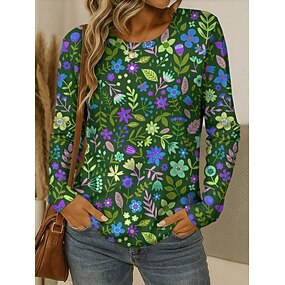 חולצת נשים קצרה עם צווארון עגול שרוול ארוך טוניק פרחוני גרפי אלגנטי קז'ואל עם צווארון עגול הדפסת רגילה יומיומית כחול סגול ירוק סתיו