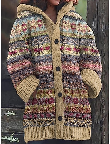 בגדי ריקוד נשים קרדיגן חופשה וינטאג' יומי גיאומטרי קולור בלוק מצולע עם קפוצ'ון סרוג דפוס כיס קדמי שרוול ארוך חולצות רגילות לִסְרוֹג בָּחוּץ יומי חגים צהוב אודם סתיו חורף