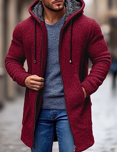 בגדי ריקוד גברים סוודר קרדיגן לִסְרוֹג סרוג צבע אחיד עם קפוצ'ון מסוגנן בָּחוּץ בית ביגוד סתיו חורף יין פול S M L