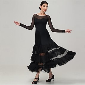 שמלת ריקודים סלוניים לנשים, רשת שיפון שחורה, שרוולים ארוכים, אלגנטית, ואלס טנגו, פוקסטרוט, שמלת תחרות הופעות