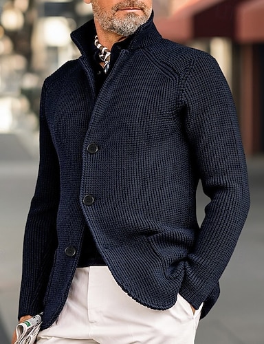 בגדי ריקוד גברים סוודר קרדיגן סוודר סרוג מצולע לִסְרוֹג רגיל כפתור למעלה צבע אחיד עומד אופנתי קלסי לבוש יומיומי פגישה (דייט) ביגוד סתיו חורף שחור נייבי כהה M L XL
