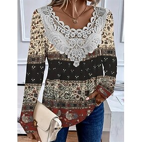 חולצת blouse נשים עם טוניקה תחרה סגנונית צוואר V עם שרוול ארוך פרחוני גרפית צמחים וינטג' קז'ואל צוואר עגול טופס רגילים הדפס יומי לצאת סופש עבודות טלאי תחרה לבן ורוד סגול ירוק חאקי סתו חורף