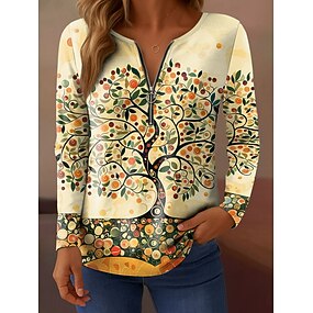 T-Shirt נשים רבע רוכסן שרוול ארוך קז'ואל גרפי פרחוני אלגנטי נוסטלגי אלגנטי V צוואר טופים רגילים יומי ורוד כחול כתום ירוק אביב סתיו