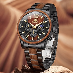 שעון העסקים החדש לגברים של olevs עם רצועת ראש מפלדת אל-חלד ועץ, זוהר, שלושה מחוגים קטנים, לוח שנה עמיד למים, שעון קוורץ רב תכליתי, שעון גברים יוקרתי, קז'ואל ואופנתי